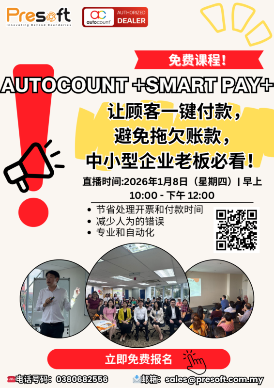 立即联系我们报名,免费学习如何用AutoCount +Smart Pay+ 把开单、收款、入账、一次搞定!